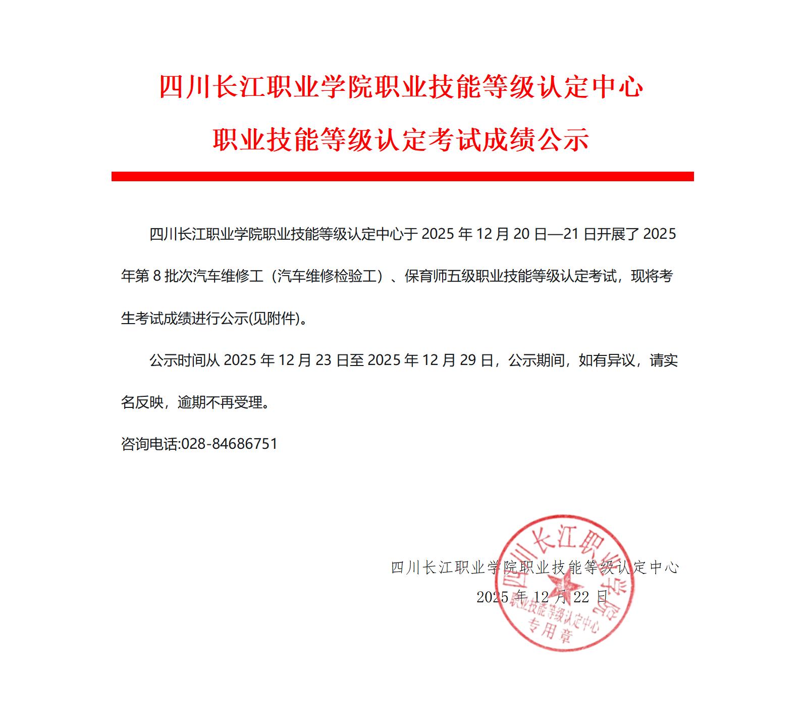 四川长江职业学院职业技能等级认定中心2025年第8批次职业技能等级认定考试成绩公示