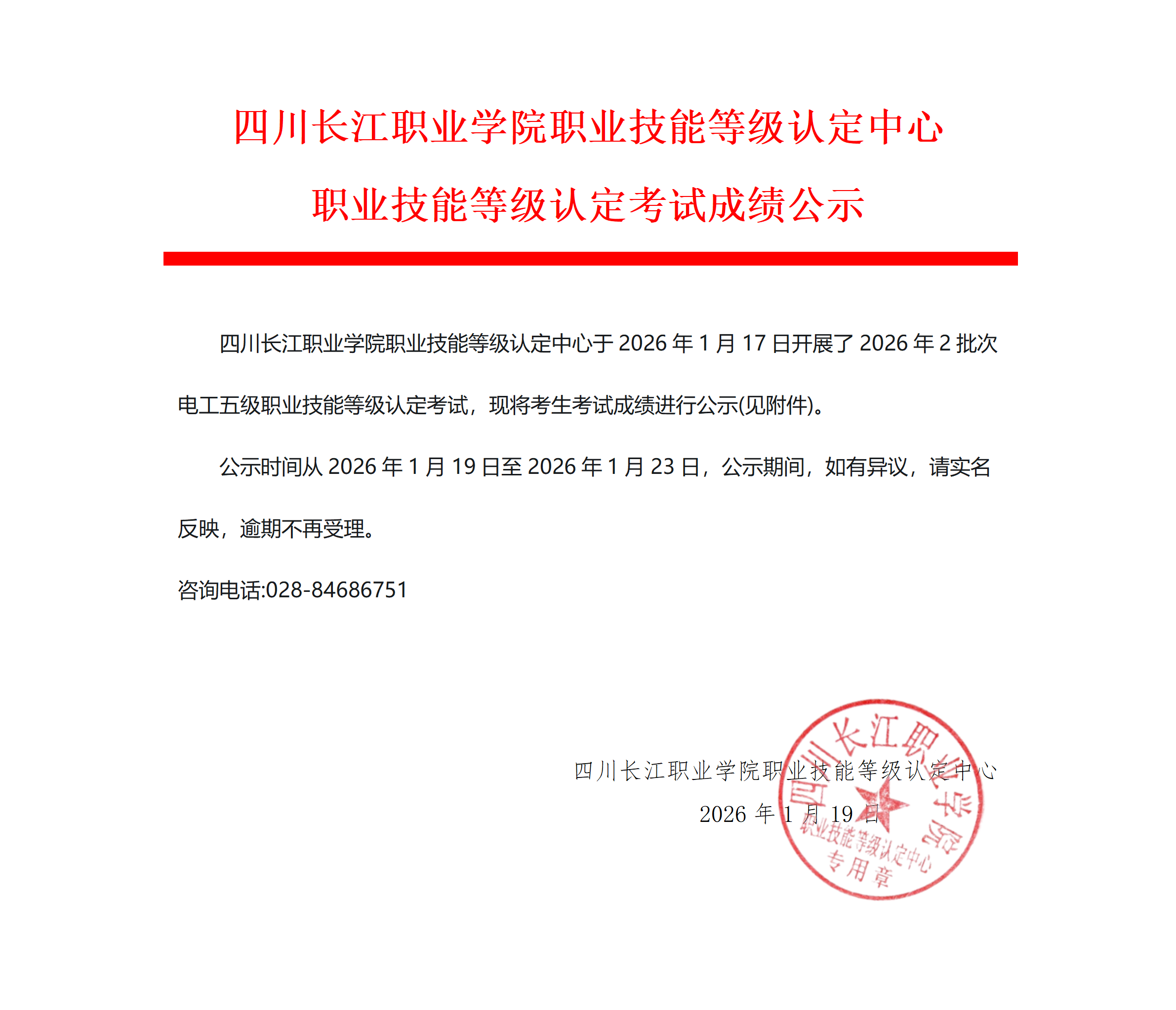 >>四川长江职业学院职业技能等级认定中心2026年第2批次电工五级职业技能等级认定考试成绩公示