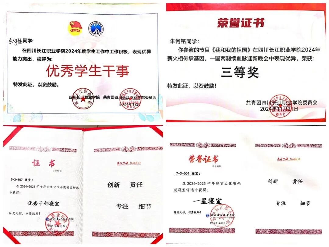 在学业与校园实践中,朱何铭表现卓越。他连续获得校级“优秀学生干部”称号,充分展现出出色的组织协调能力与积极进取的精神;同时,他带领寝室成员共同营造温馨整洁的生活环境,所在寝室获评“星级寝室”,成为校园文明生活的标杆。这些荣誉见证了他在班级管理与集体建设中的突出贡献。