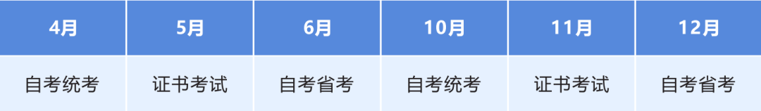 每年2次国家统考、2次证书课程考试、2次省考、2次论文答辩和毕业申请。