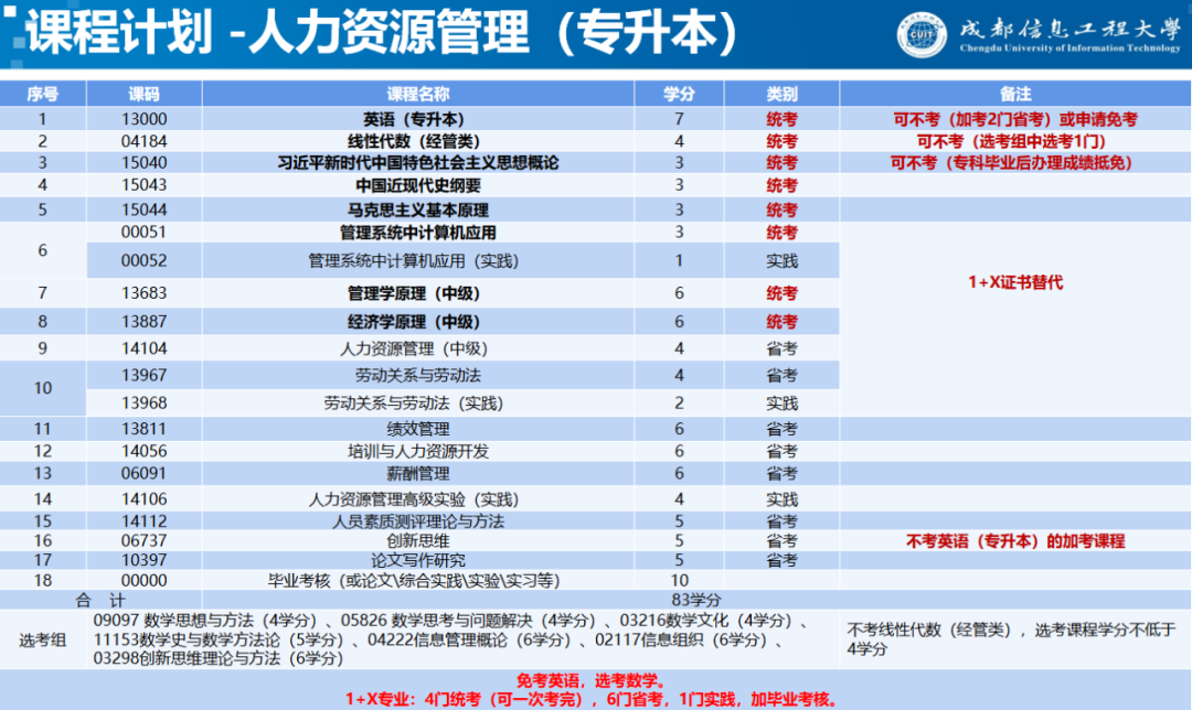 经四川省高等教育招生考试会员会批准,成都信息工程大学人力资源管理(专升本)专业为“职业技能等级证书与自学考试课程学分认定转换”项目试点专业,即“1+X”项目。即“学历证书+职业技能等级证书”模式,获得名校文凭的同时,收获多项实用技能认证。
