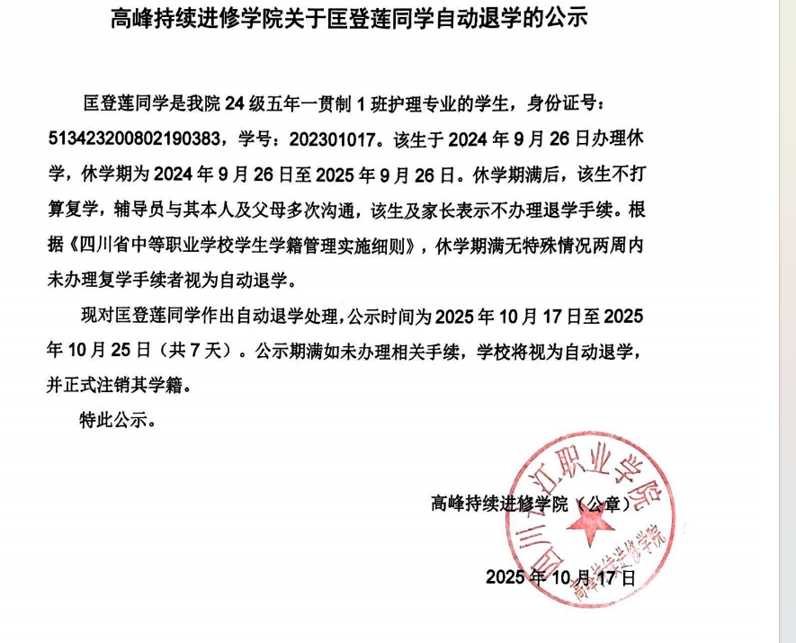 高峰持续进修学院关于匡登莲同学自动退学的公示